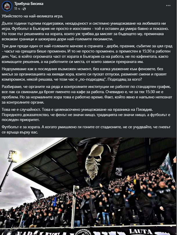 Пловдивското дерби не е някакъв си мач от програмата. Това е ден, който се чака. Ден, около който хората си подреждат живота – работа, пътувания, отпуски, смени. И точно затова решението часът на Ботев - Локомотив да бъде преместен три дни преди мача е не просто скандално. То е показно отношение към всеки, който живее с футбола.