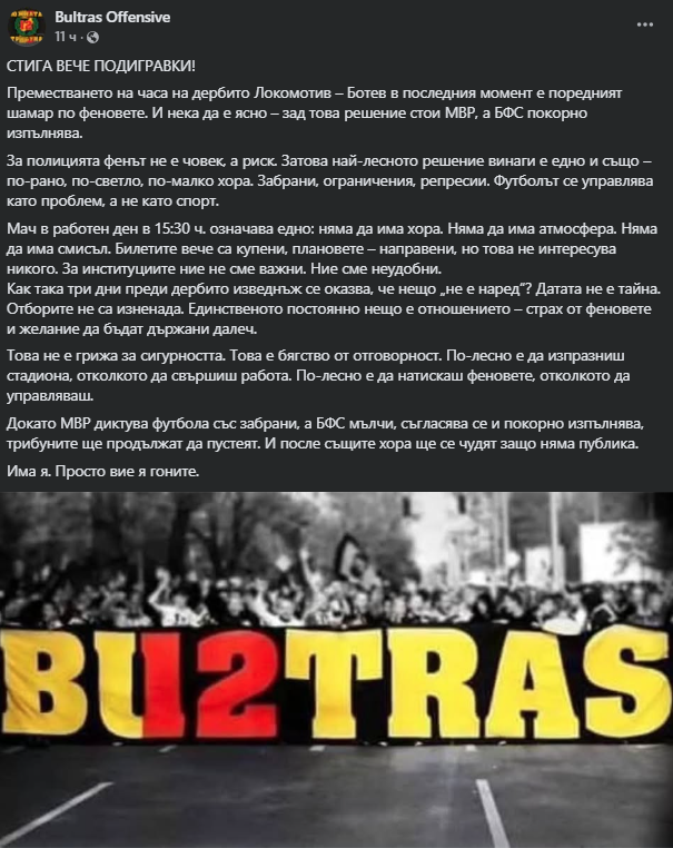 Официалното оправдание е „сигурност“. Любимата дума, зад която се крие всичко – некадърност, липса на организация и страх от феновете. За МВР фенът не е човек, а проблем. За БФС - досаден детайл. И когато не знаят как да се справят, решението е едно и също: да ни няма.