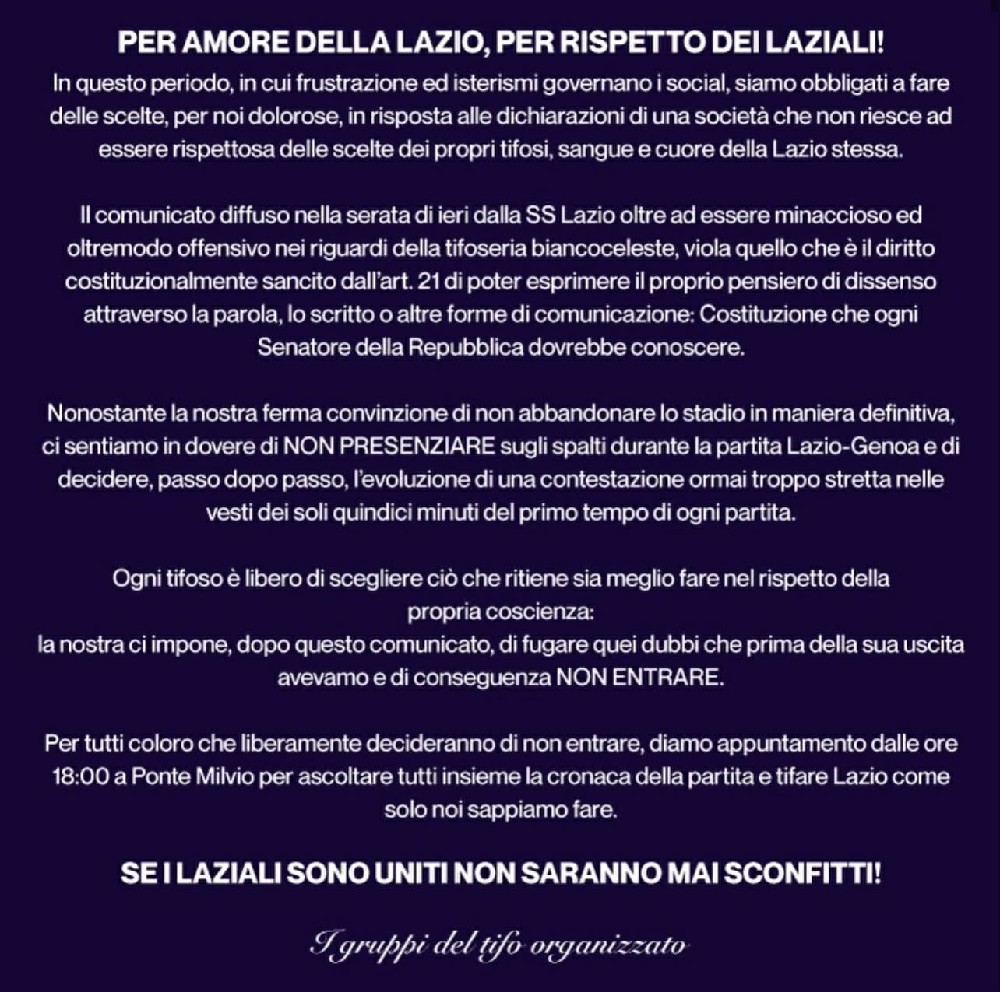 Ръководството на Лацио осъди бойкота като недопустим опит за натиск върху клуба и отбора. В отговор ултрасите заявиха, че протестът им е конституционно право и морален дълг към клуба, който според тях е в упадък. Те подчертаха, че не се отказват завинаги от стадиона, но смятат за необходимо да ескалират протеста, като не присъстват на мача срещу Дженоа и се съберат извън стадиона, за да подкрепят Лацио по свой начин.